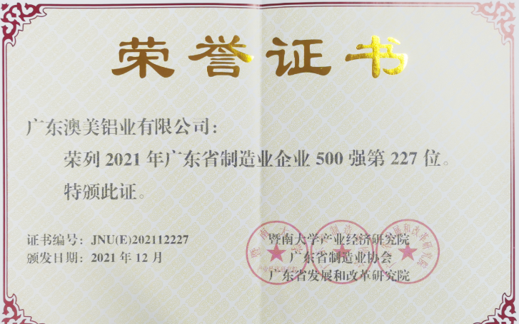 排名躍升,澳美鋁業再次榮膺廣東制造業500強
